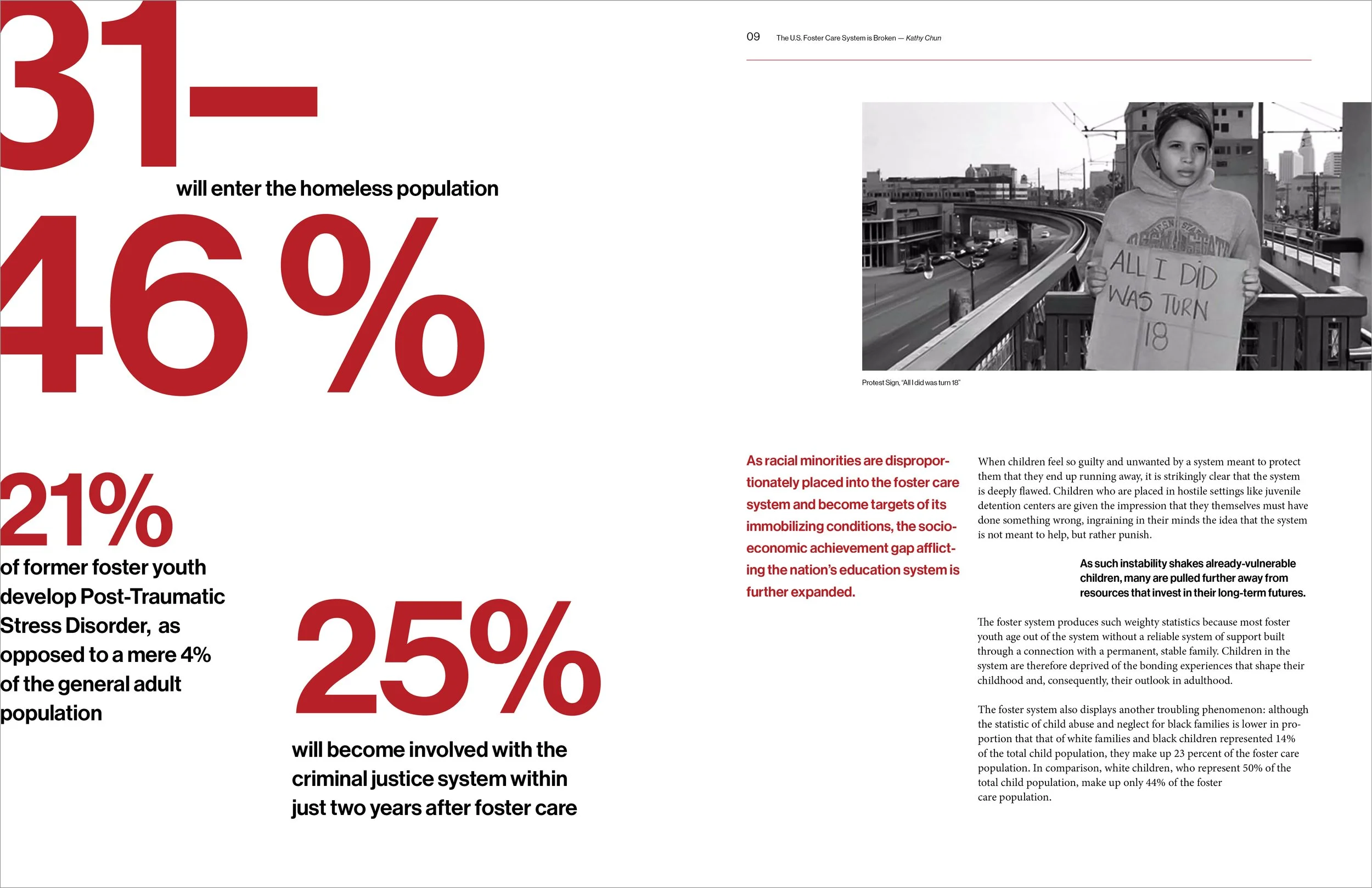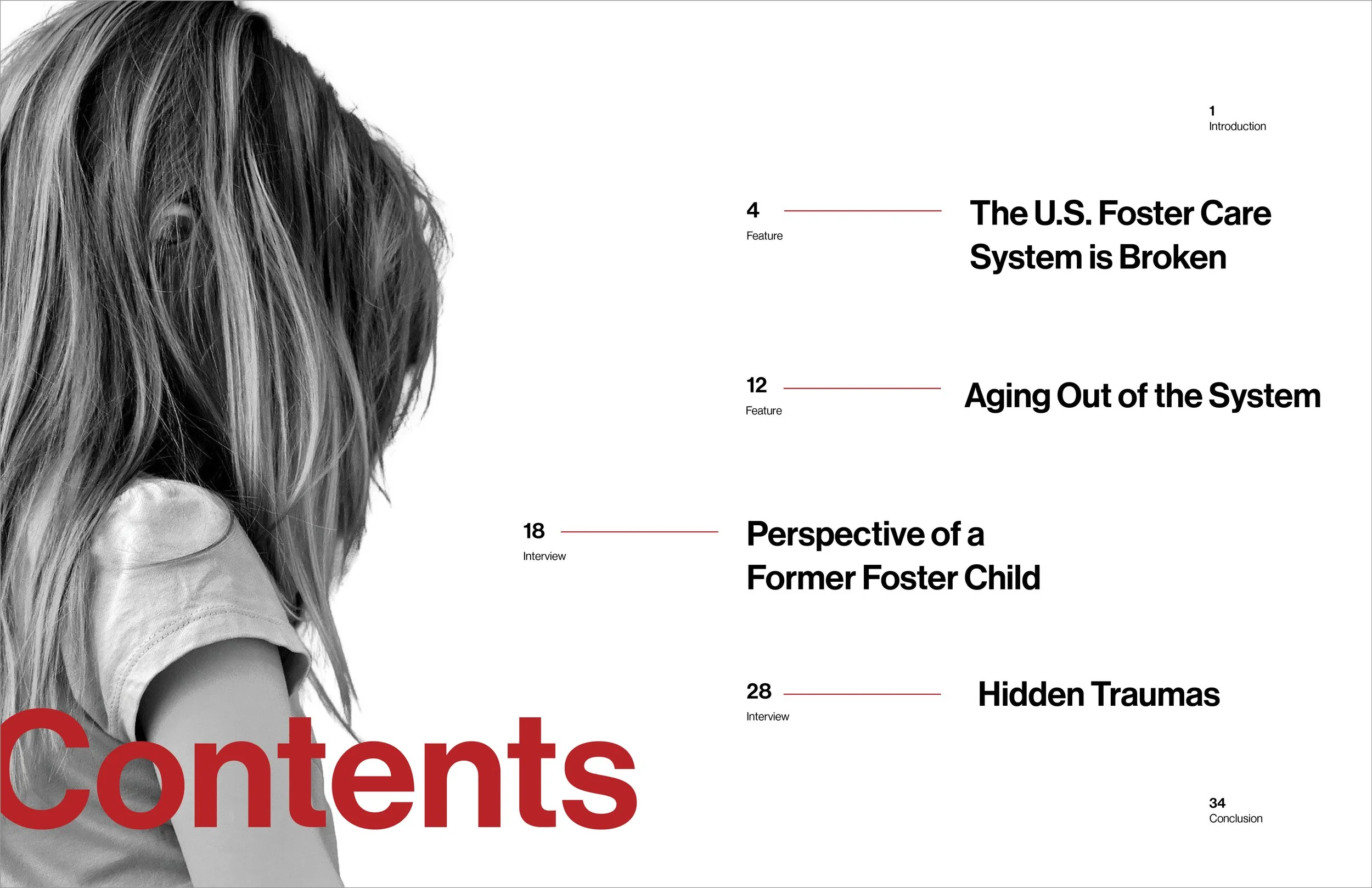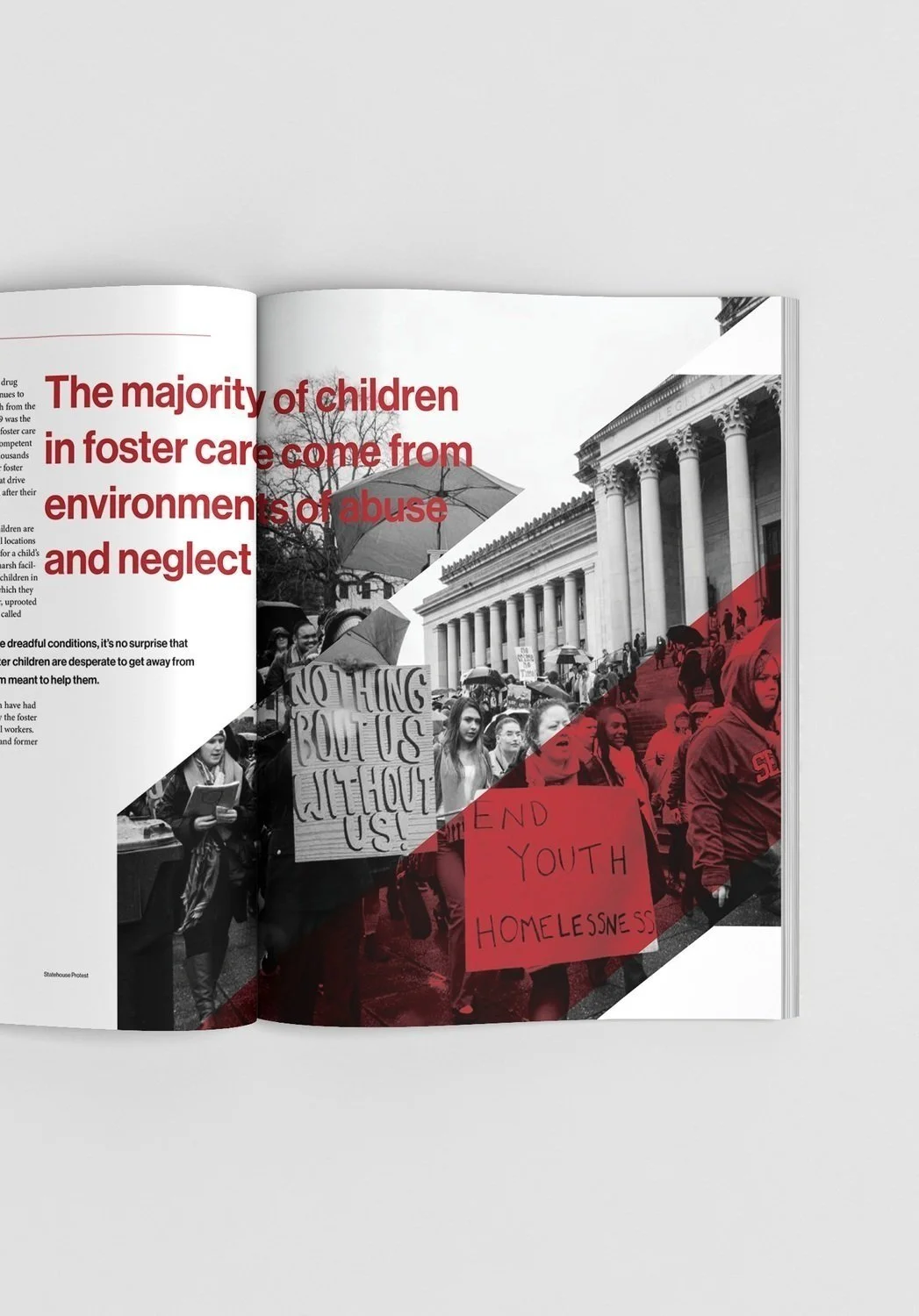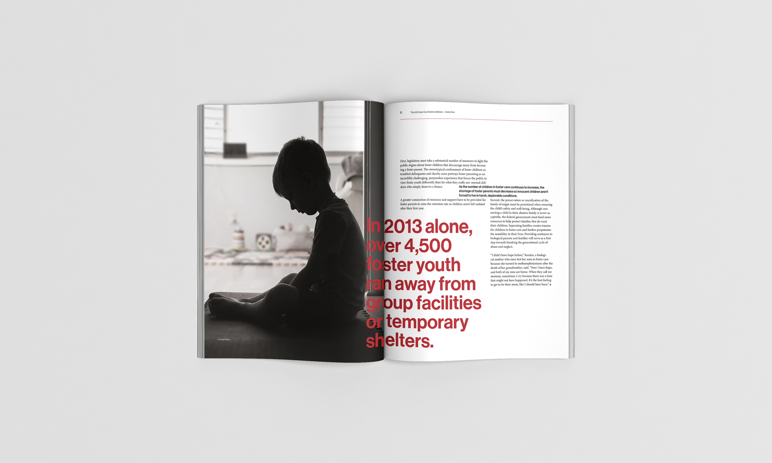 The wordmark expresses the fragility of foster children. The curved and thin lines show the humanly, yet vulnerable aspects. Harsh lines and the broken “l” come in to show how harsh and broken the system is. We can see this same angle in the “l” further in the publication.