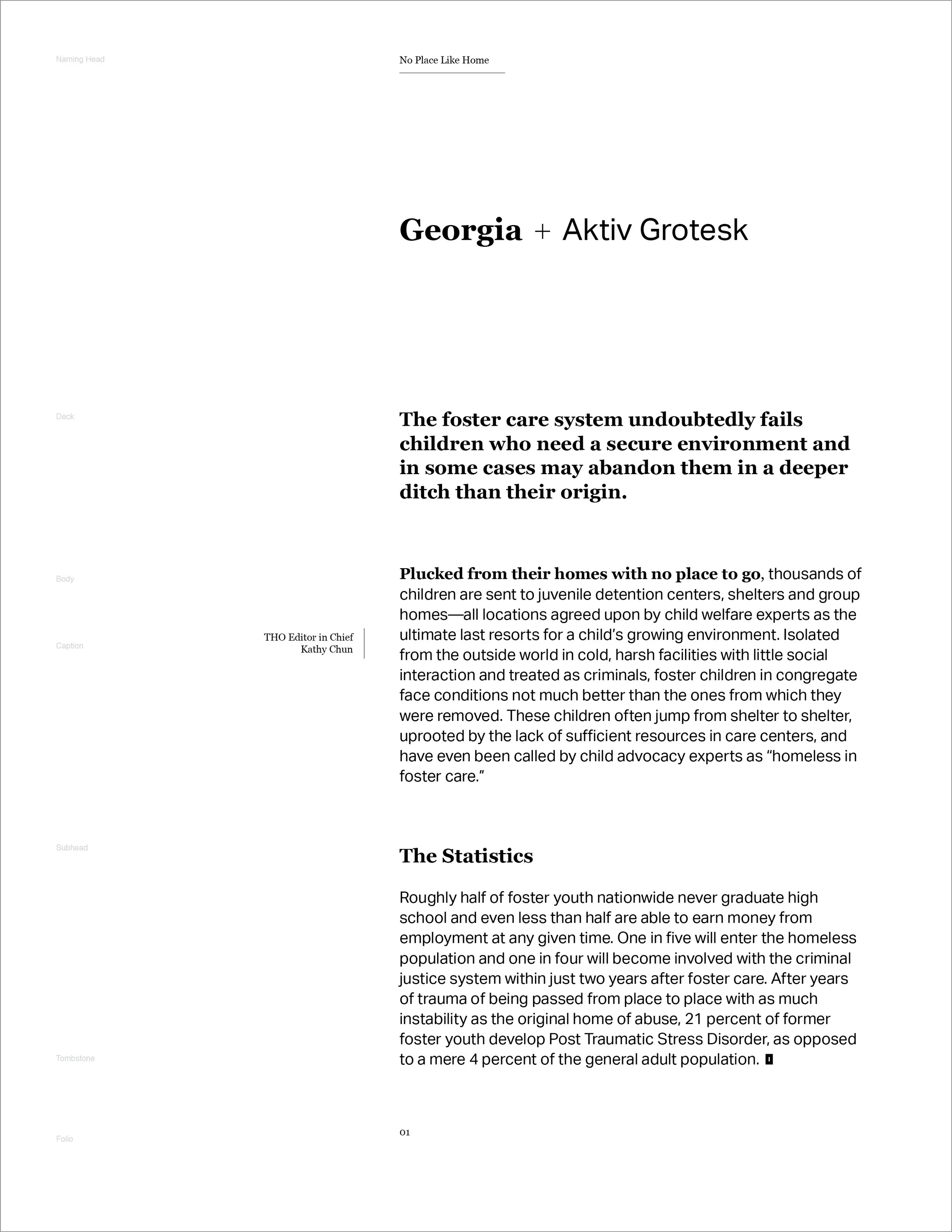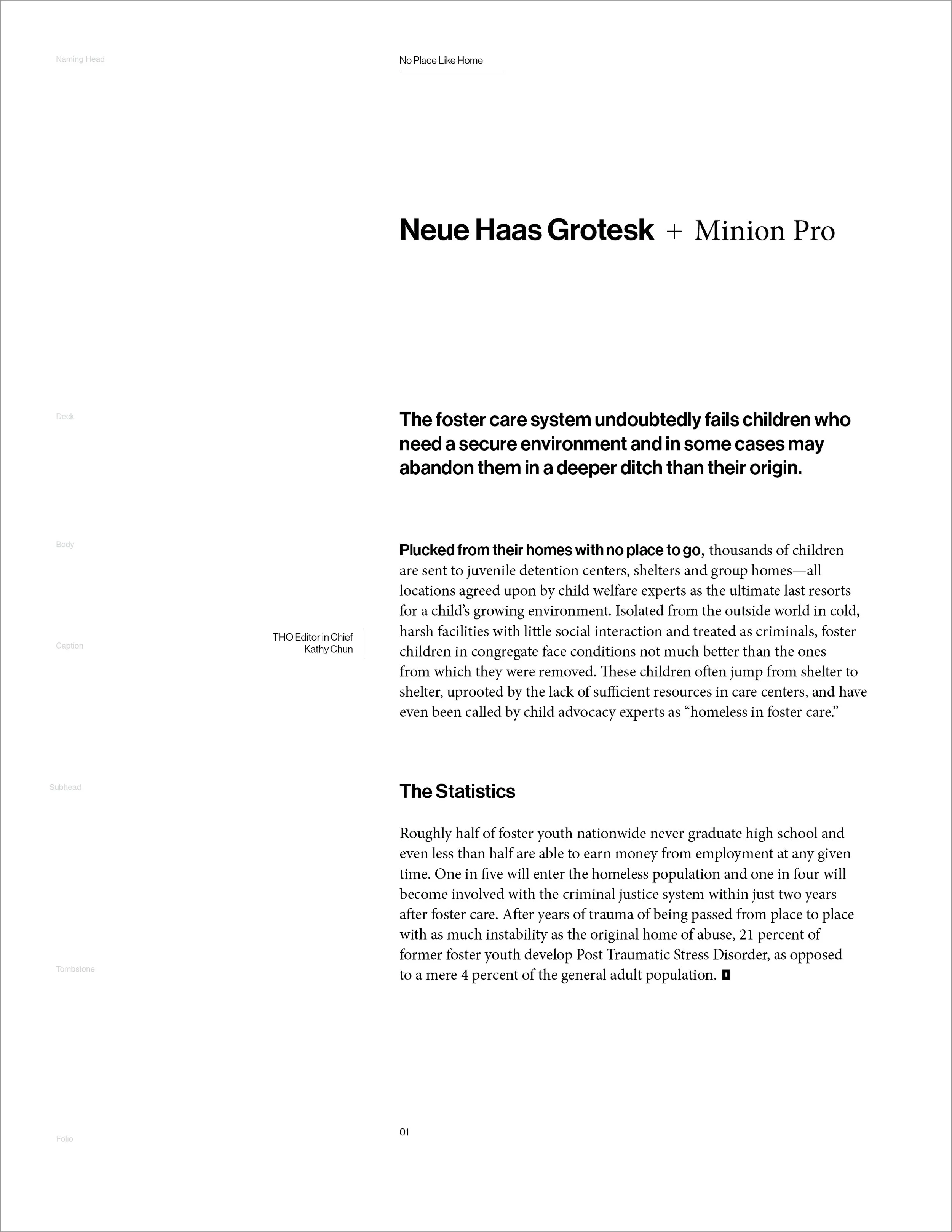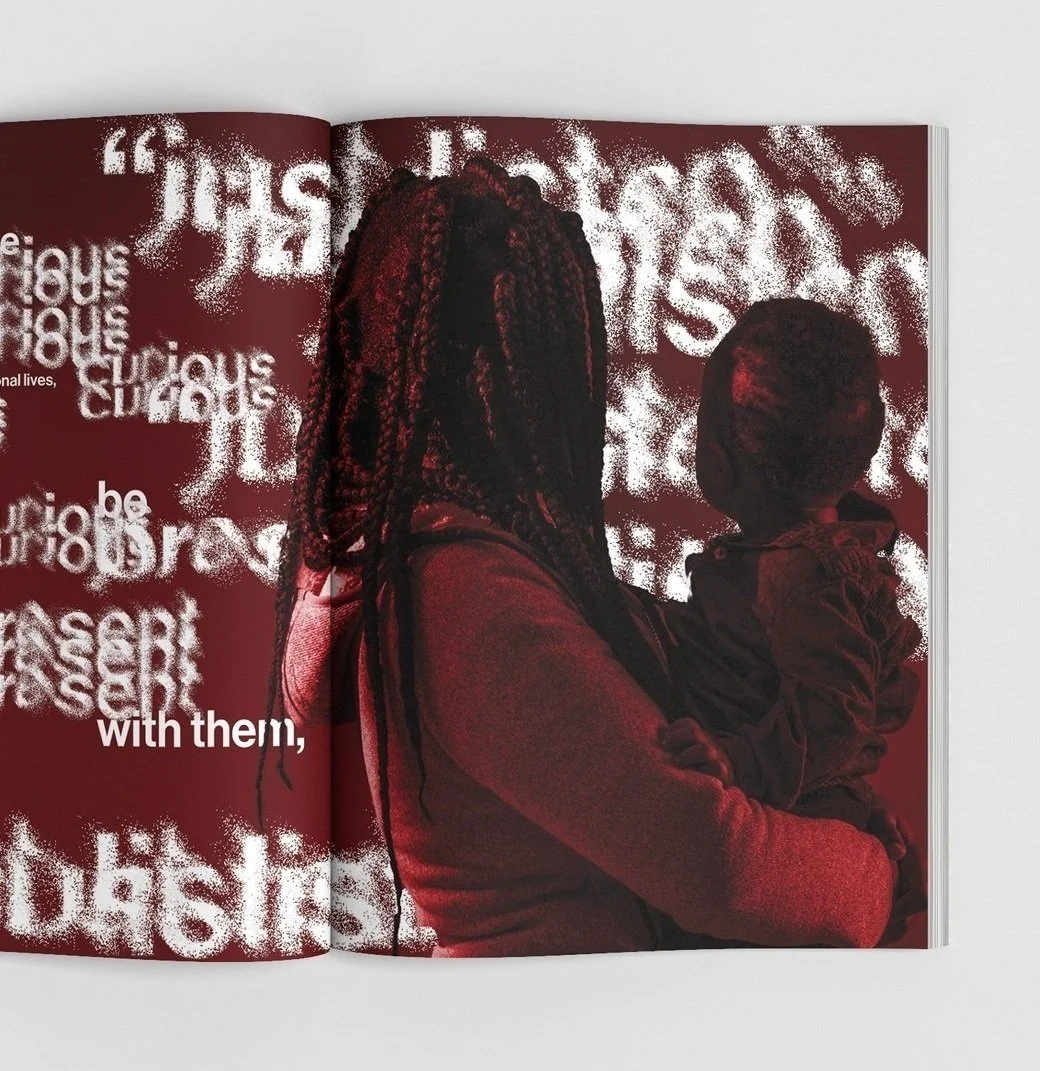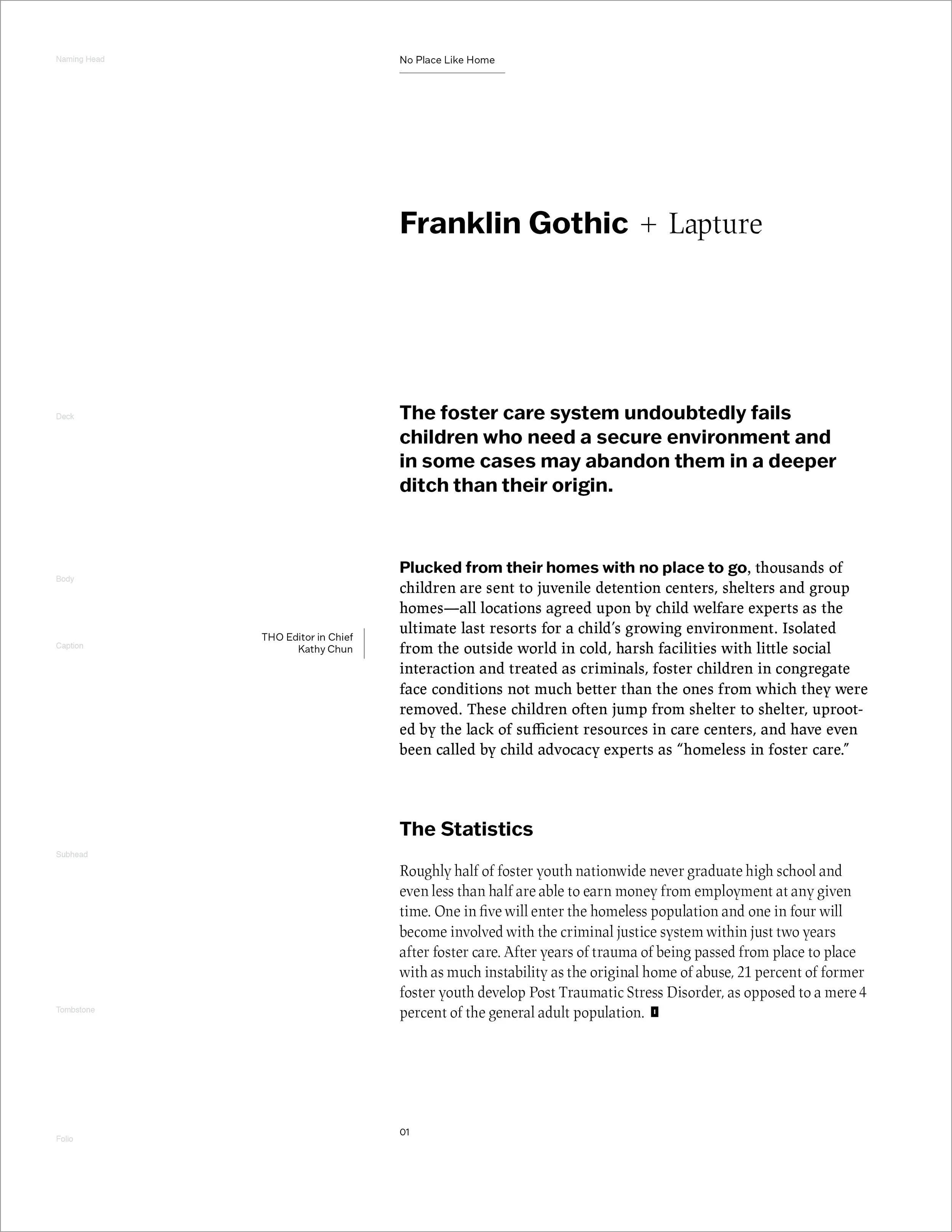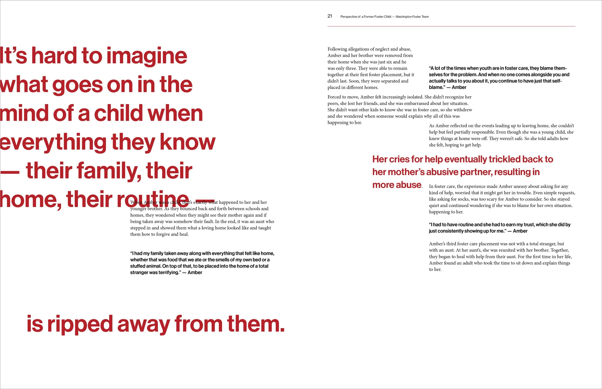 The wordmark expresses the fragility of foster children. The curved and thin lines show the humanly, yet vulnerable aspects. Harsh lines and the broken “l” come in to show how harsh and broken the system is. We can see this same angle in the “l” further in the publication.