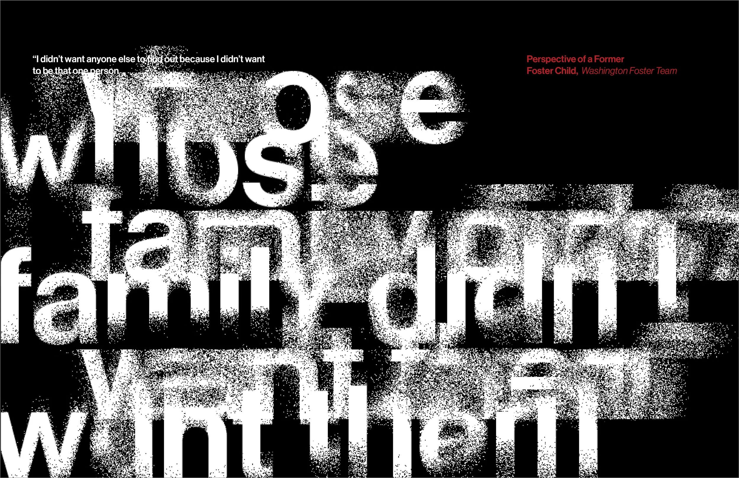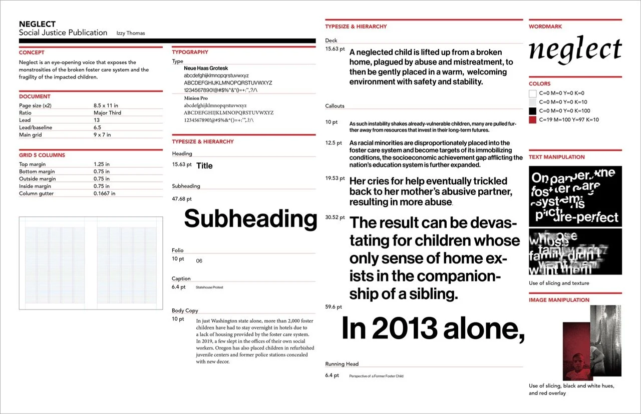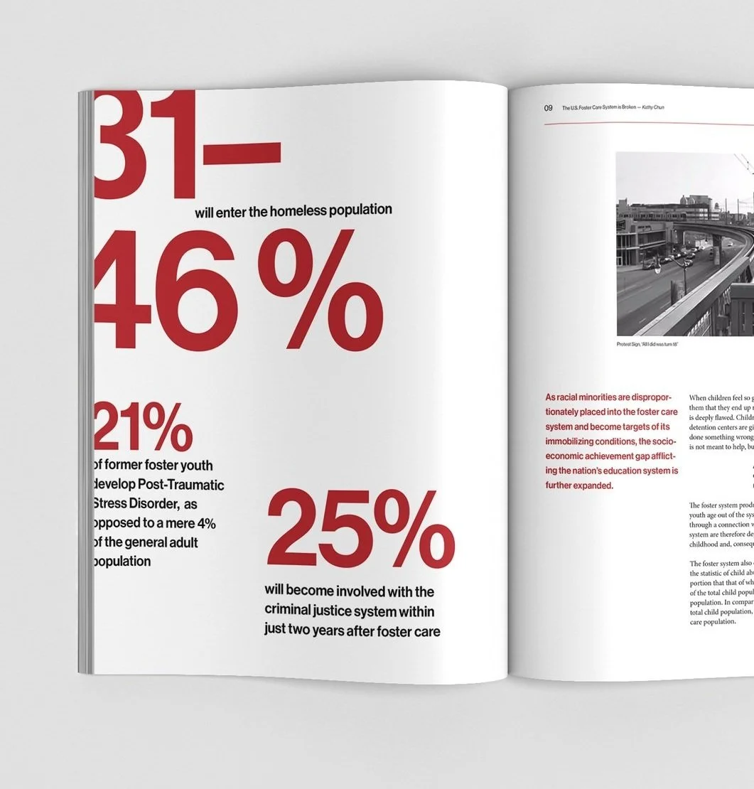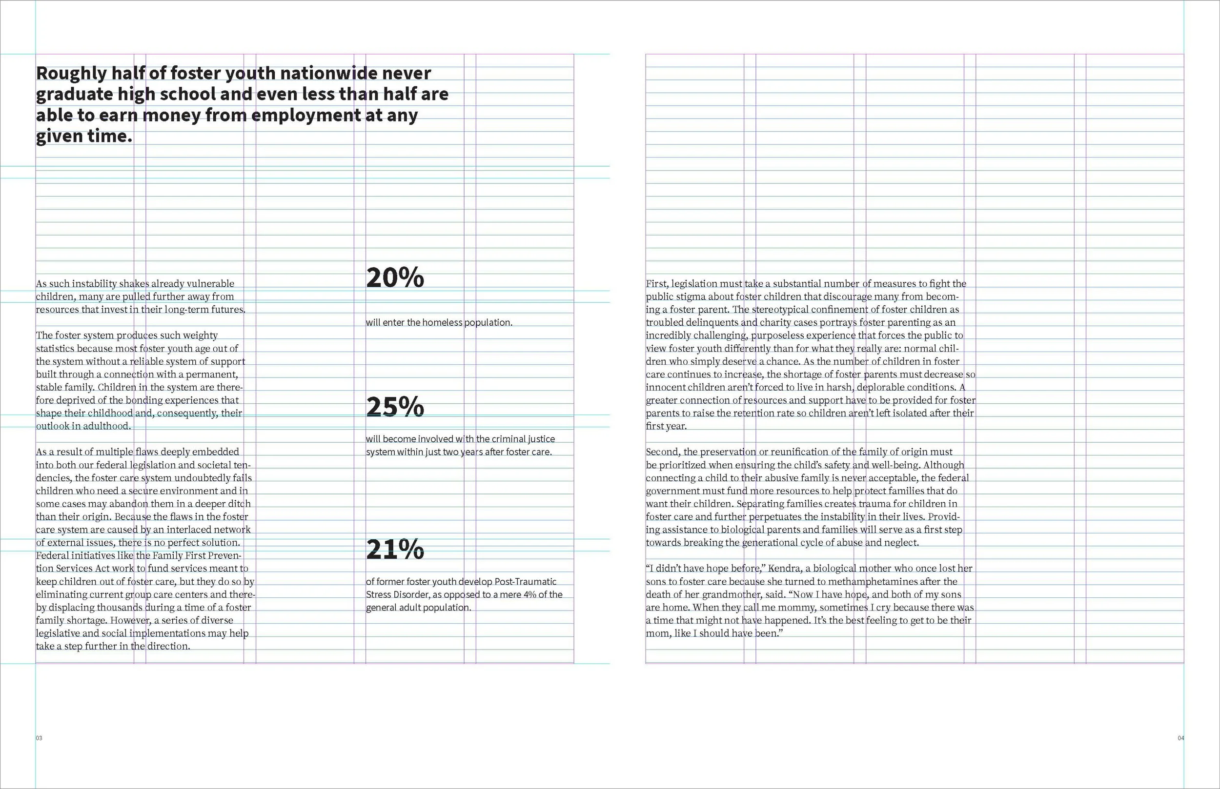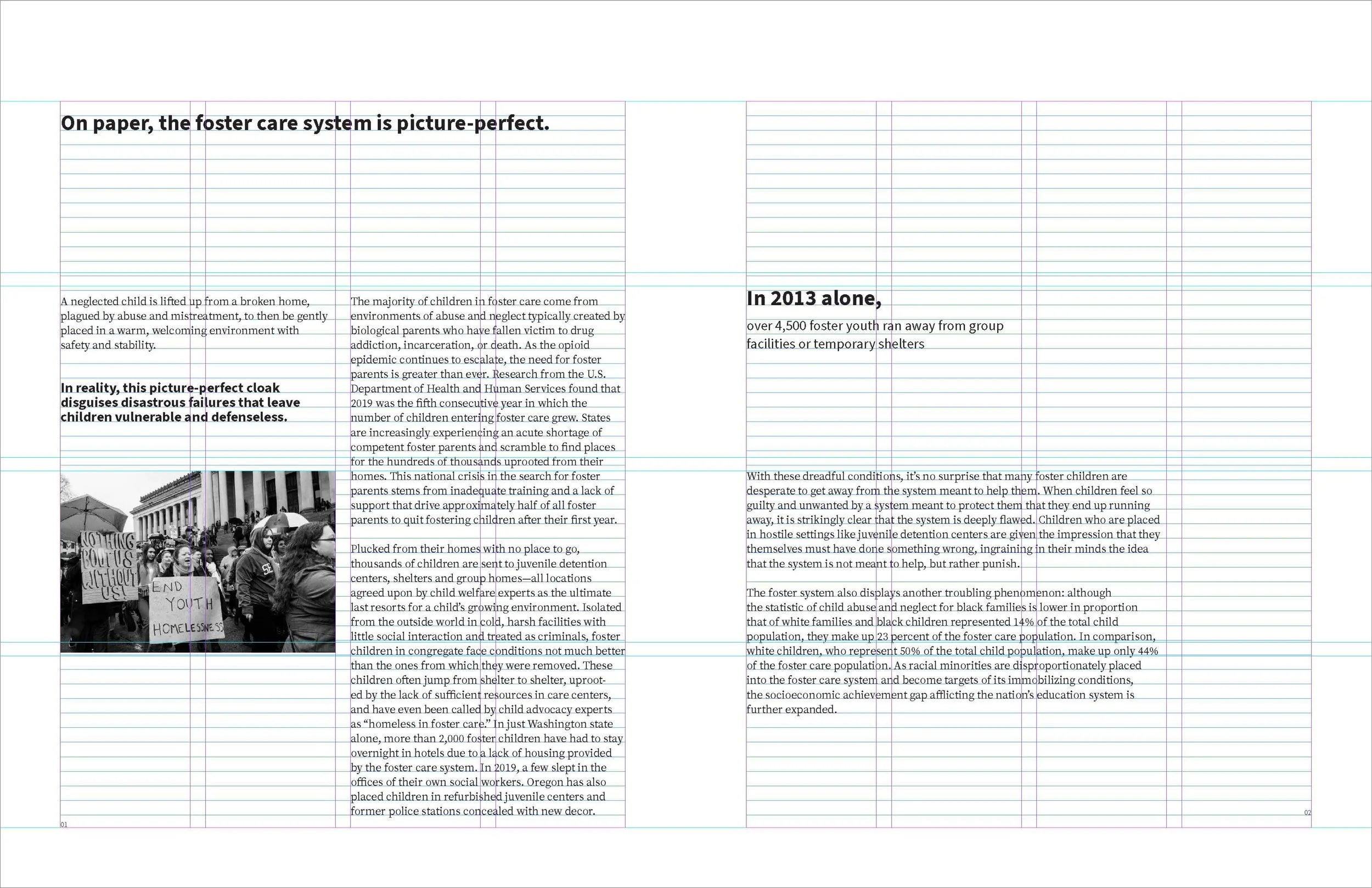In this project we were assigned to develop a wordmark, identity, and visual system to create a publication. This shows the ability to type-set, create a design system, and apply type hierarchy. My goal is to show the many layers and monstrosities of the foster care system in the United States.
